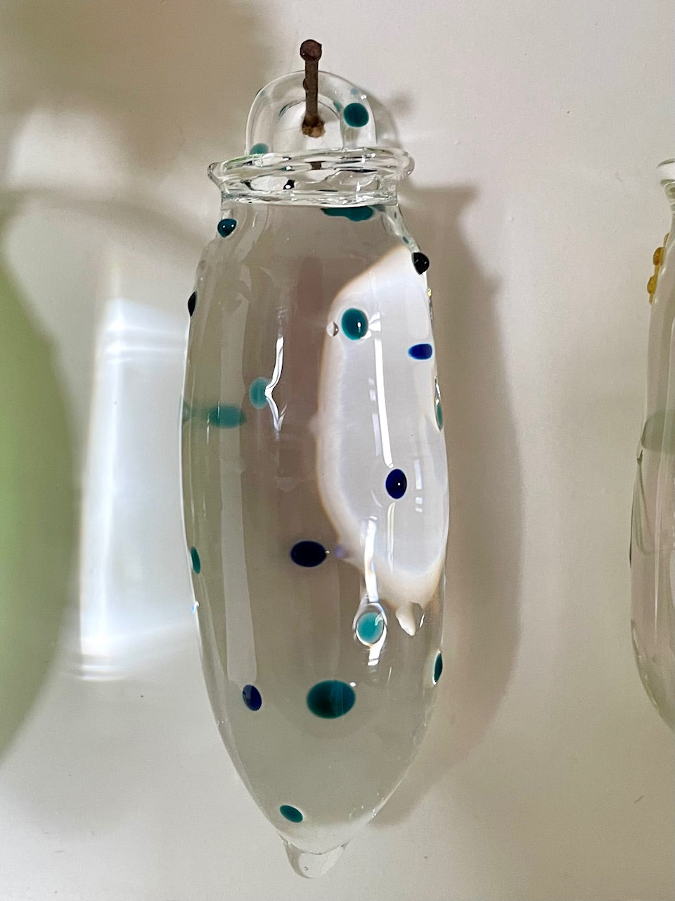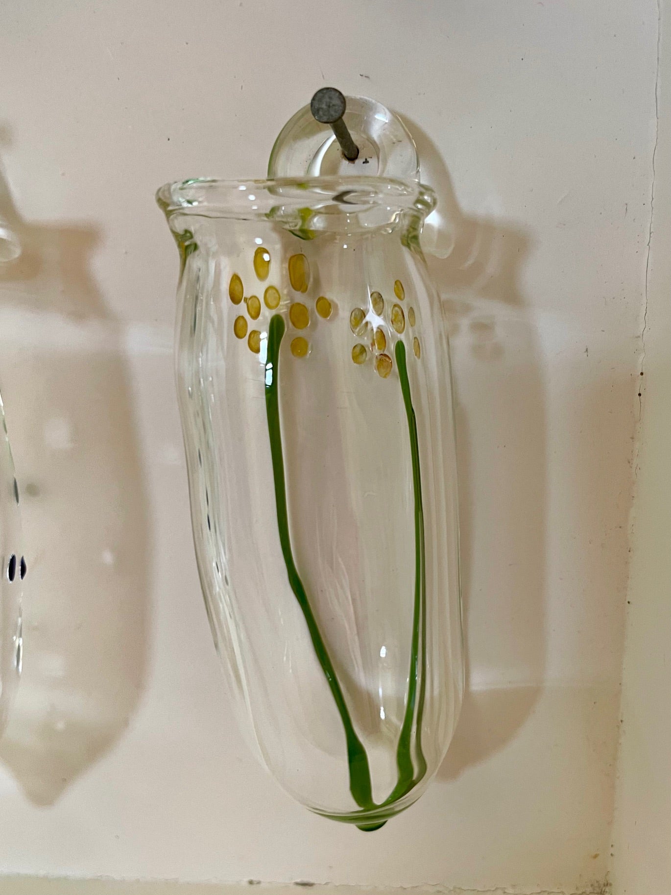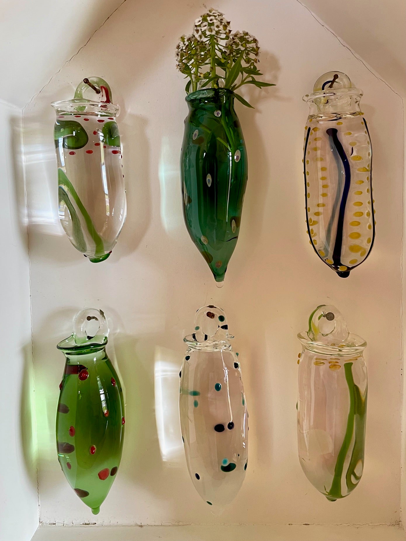 Artist process: These wall vases are handcrafted using the traditional lampworking technique, where molten glass is shaped in a hot flame. On a glass tube, patterns are drawn with a pencil-thin rod of coloured glass, fused and blown.
