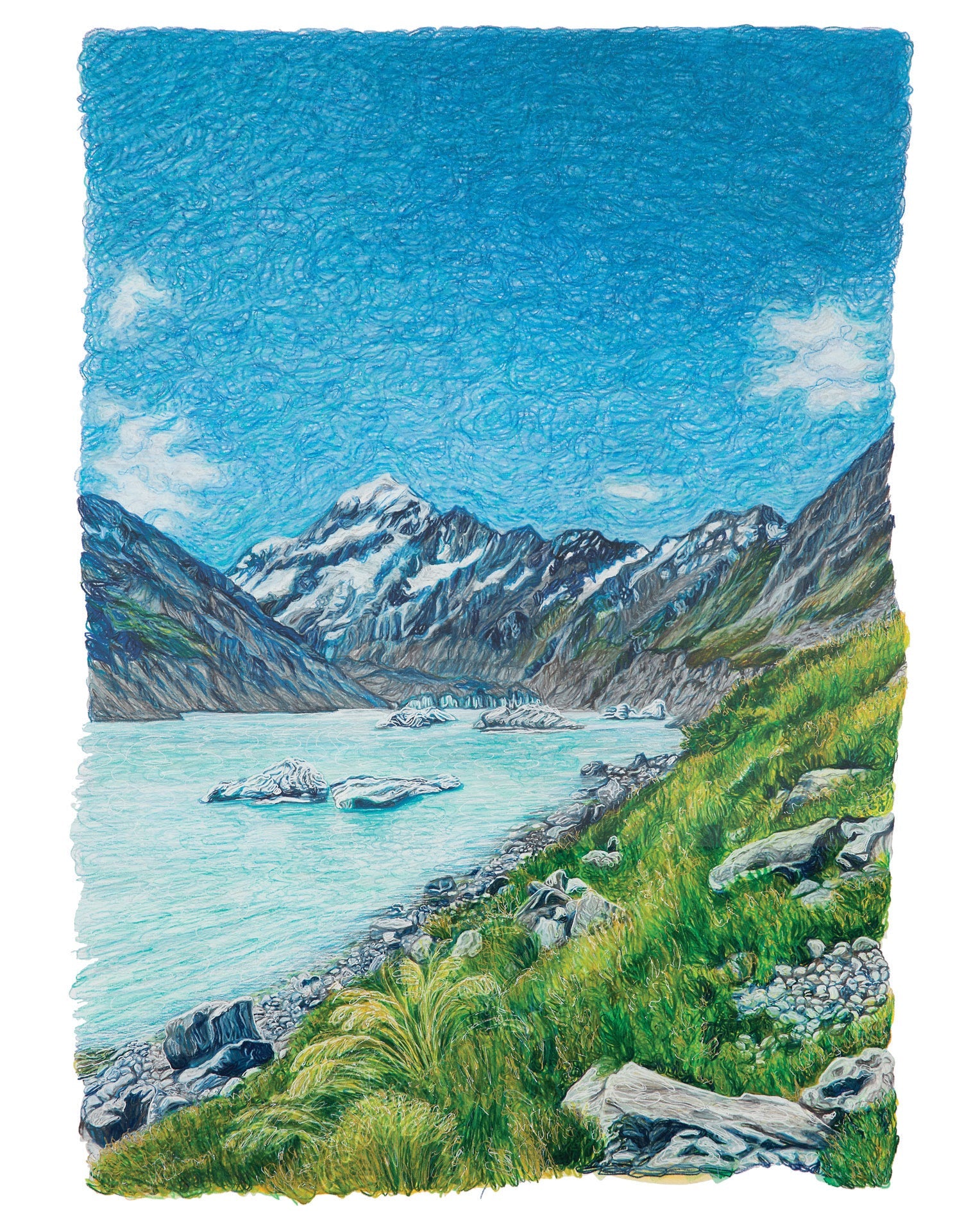 A summer adventure to Hooker lake inspired this mixed media drawing that captures the magnificent Aoraki Mt. Cook.