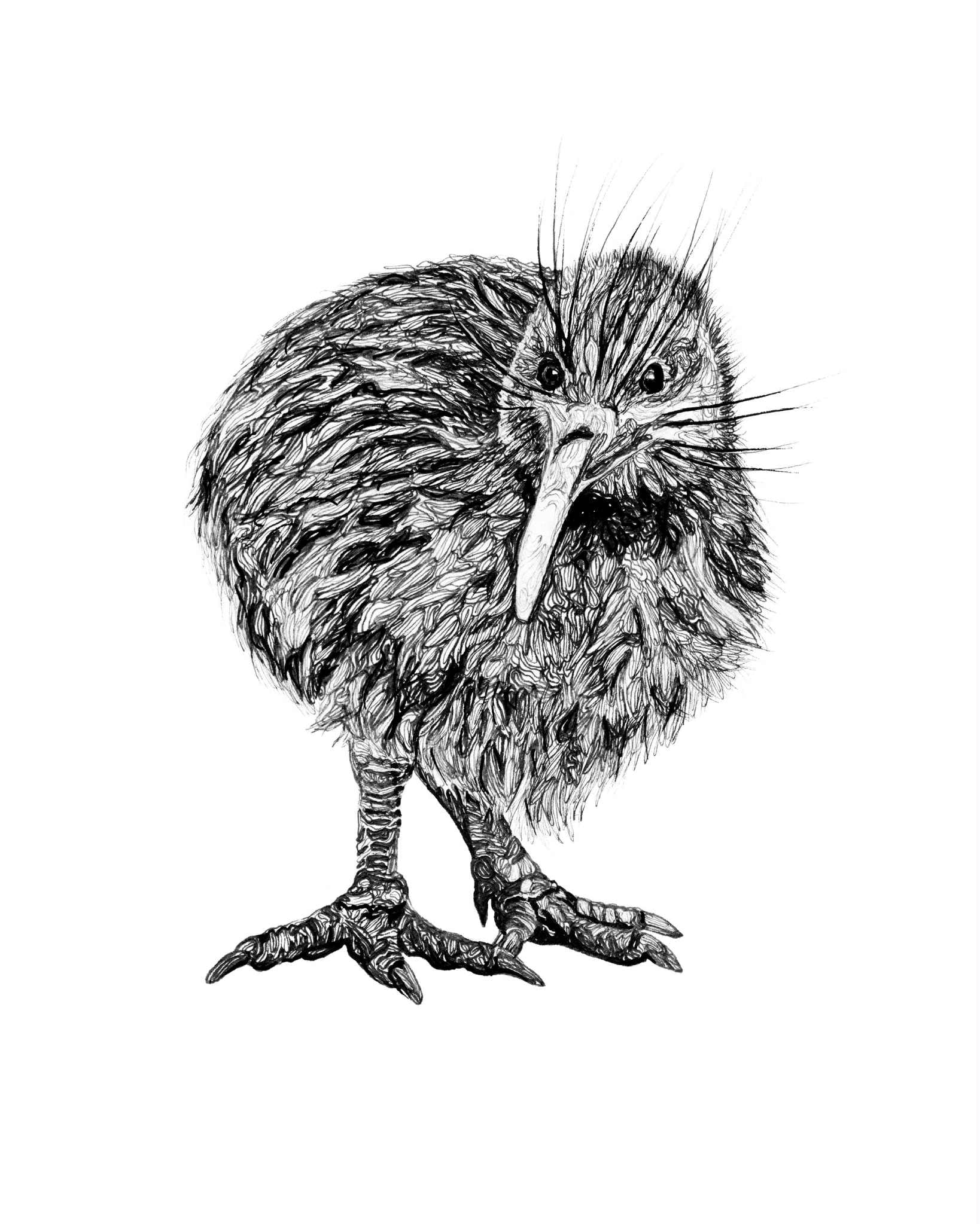 Lara used a range of different pigment liners in varying widths to depict the elusive and iconic New Zealand Kiwi. Rich detail perfectly captures its fluffy plumage and mysterious character.