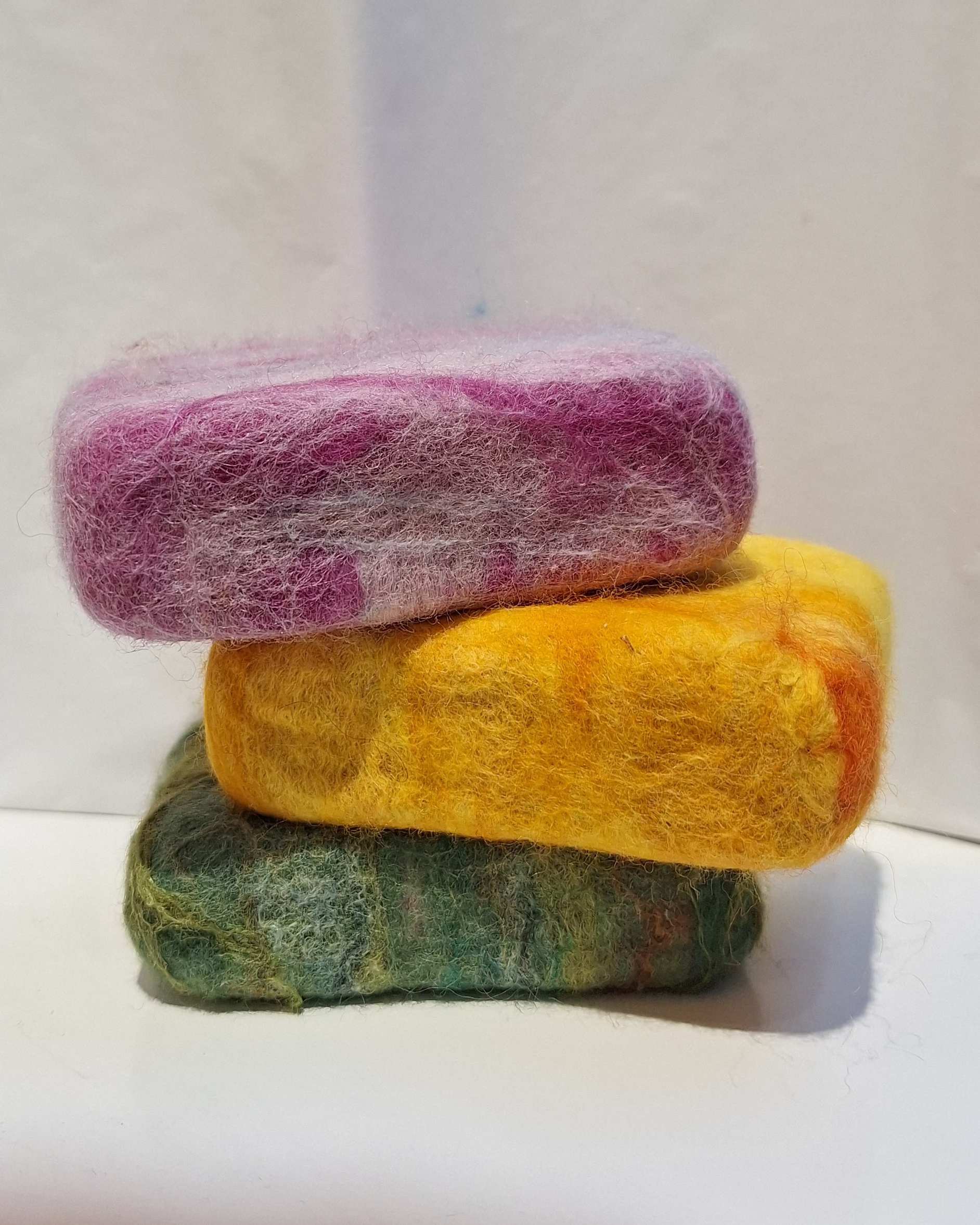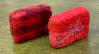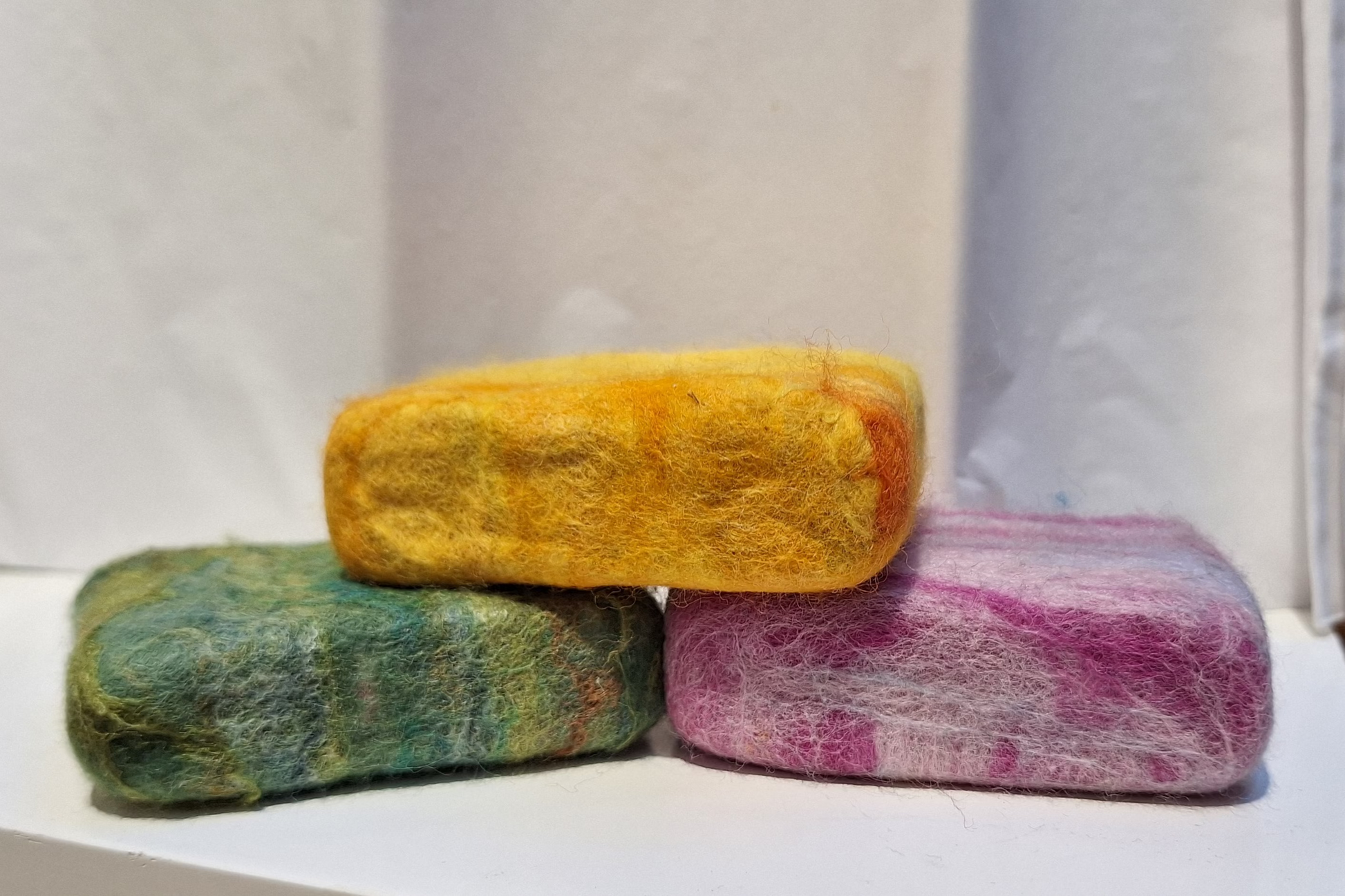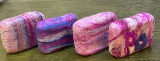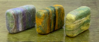 Artistic Process: Using a selection of bright colourful NZ Merino, this is hand-felted directly onto the pre handmade shea butter soap, giving a tight covering, which is slowly naturally dried to produce a finished felted soap. The soap is scented with a selection of perfume oils.