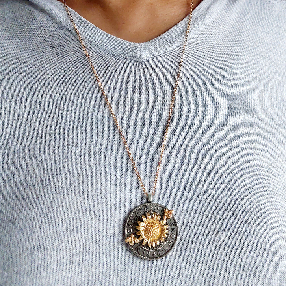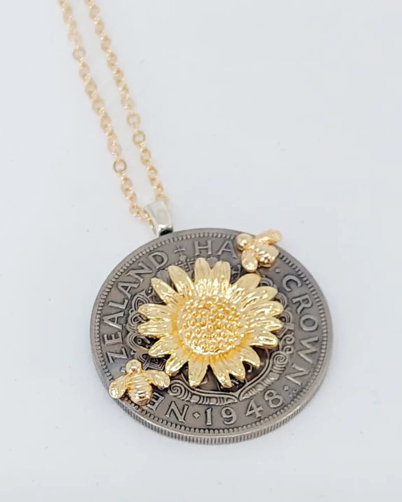This lovely recycled coin pendant consists of a vintage Half Crown with NZ's Coat of Arms. Beautiful embellishments have been added to the coin in the form of a large golden sunflower and two tiny bees "flying" towards it from different ends.