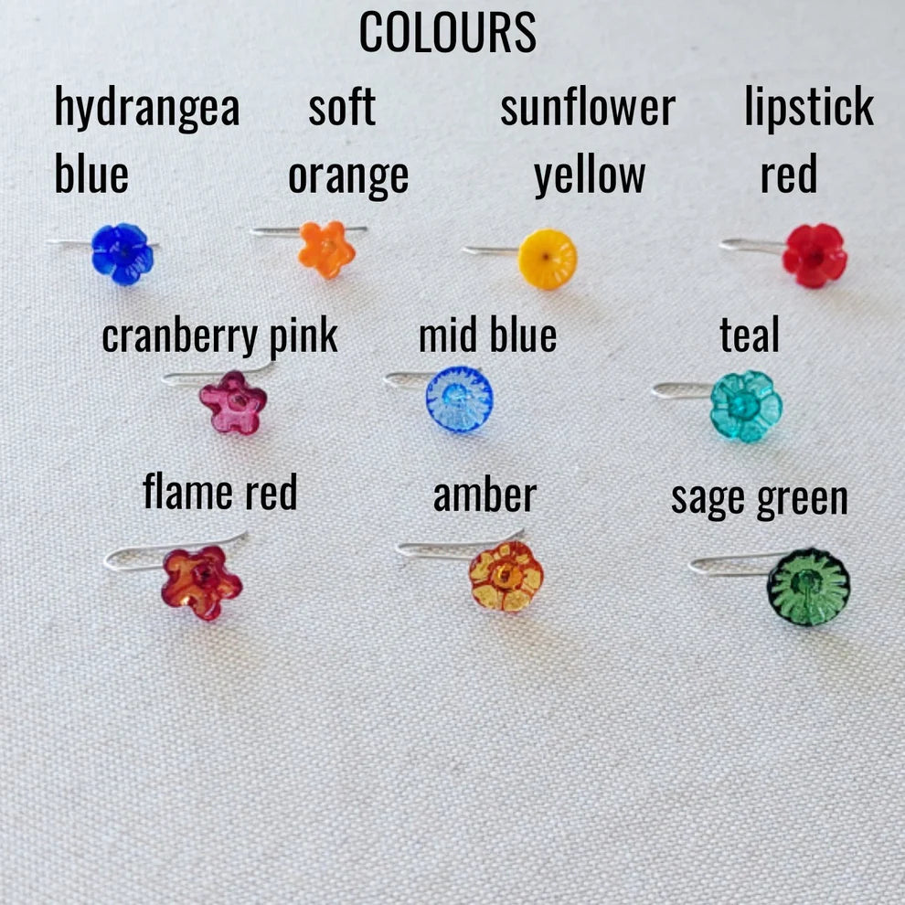 Handmade by us and and available in ten colours and three different flower shapes - this one is a classic, five petal flower style with soft edges & sterling silver posts.