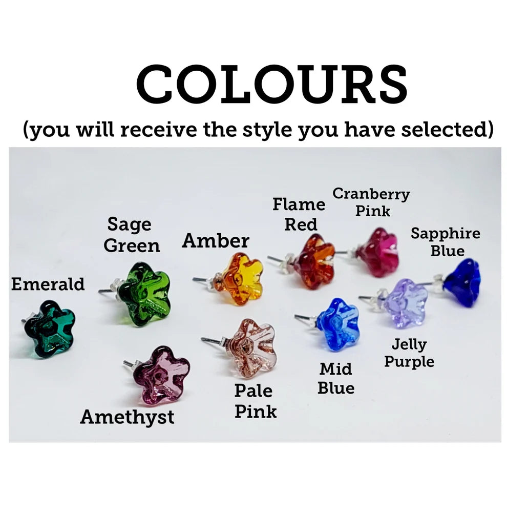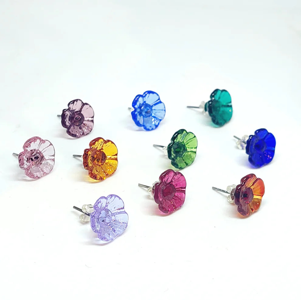 Handmade by us and and available in ten colours and three different flower shapes - this one is a classic, five petal flower style with soft edges & sterling silver posts.