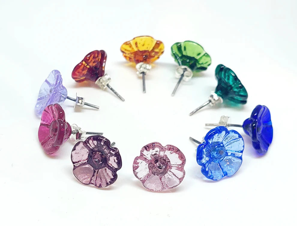 About the Artist: Each pair of earrings have been created with handmade sterling silver posts and handmade lampwork glass flowers in a classic five petal form.