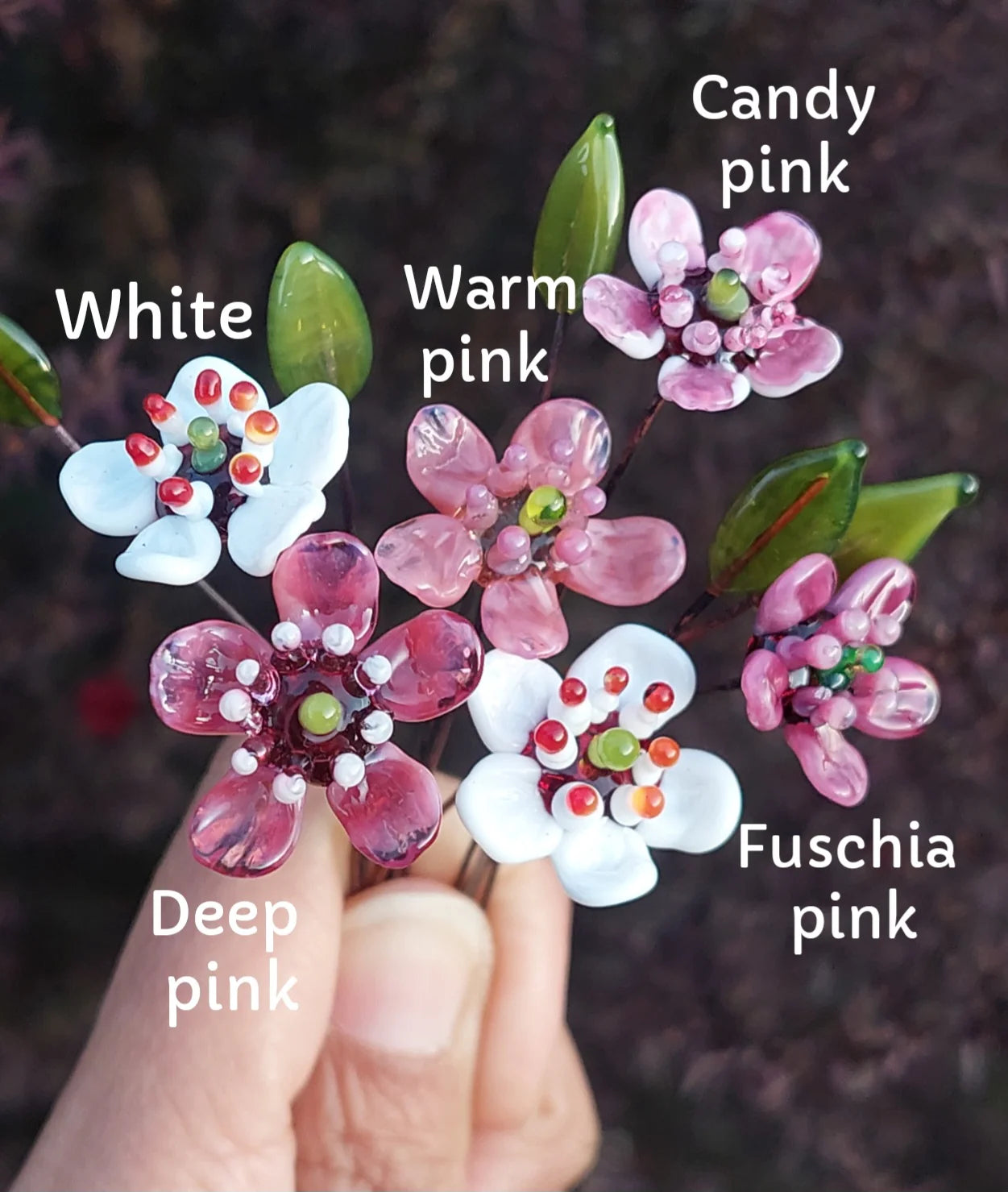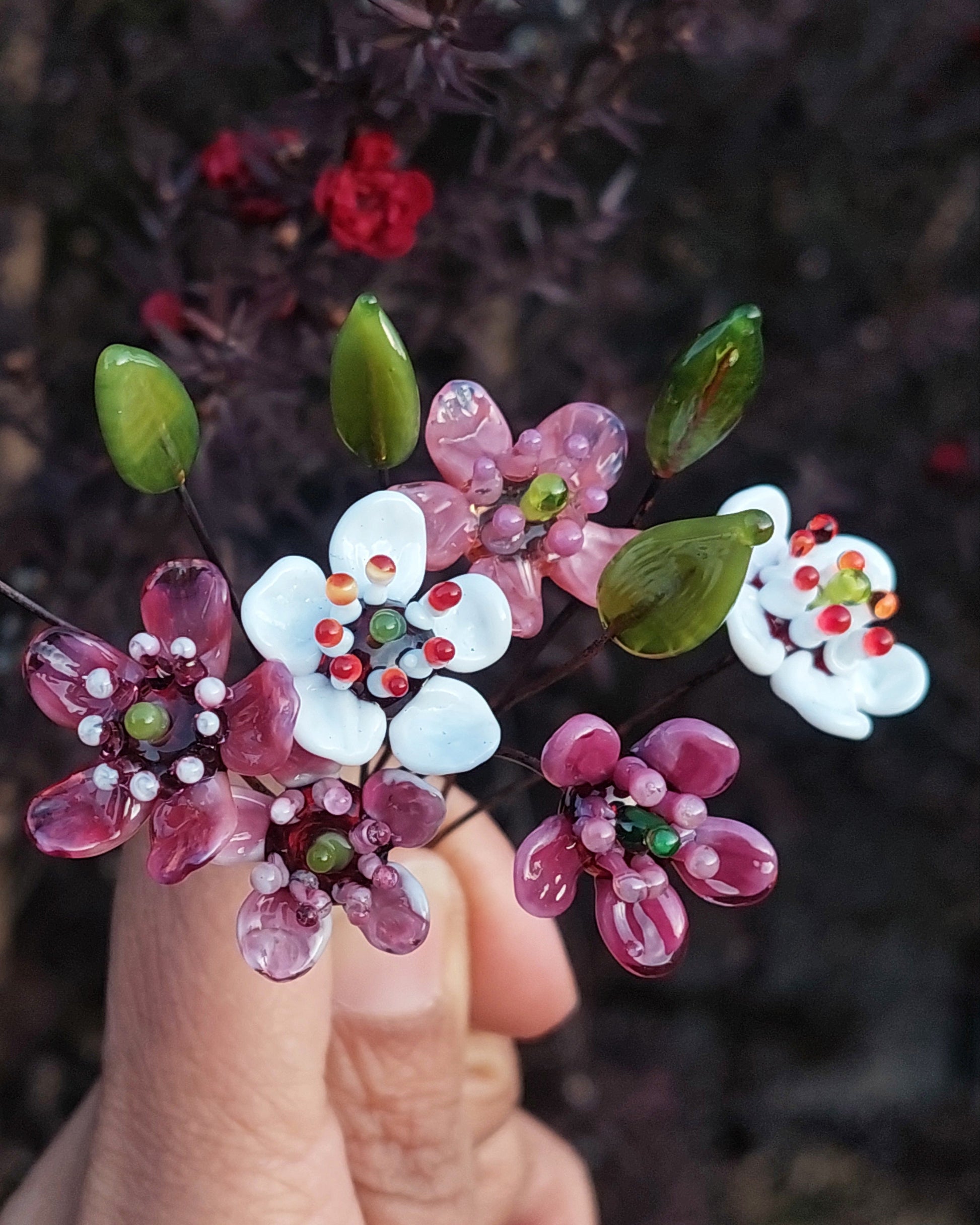 Artistic Process: All glass flowers are made by hand, free-form (no molds used). The lampwork technique has been used to create them, including melting Venetian glass over a specialised torch, sculpting various forms, then kiln-firing to ensure durability.