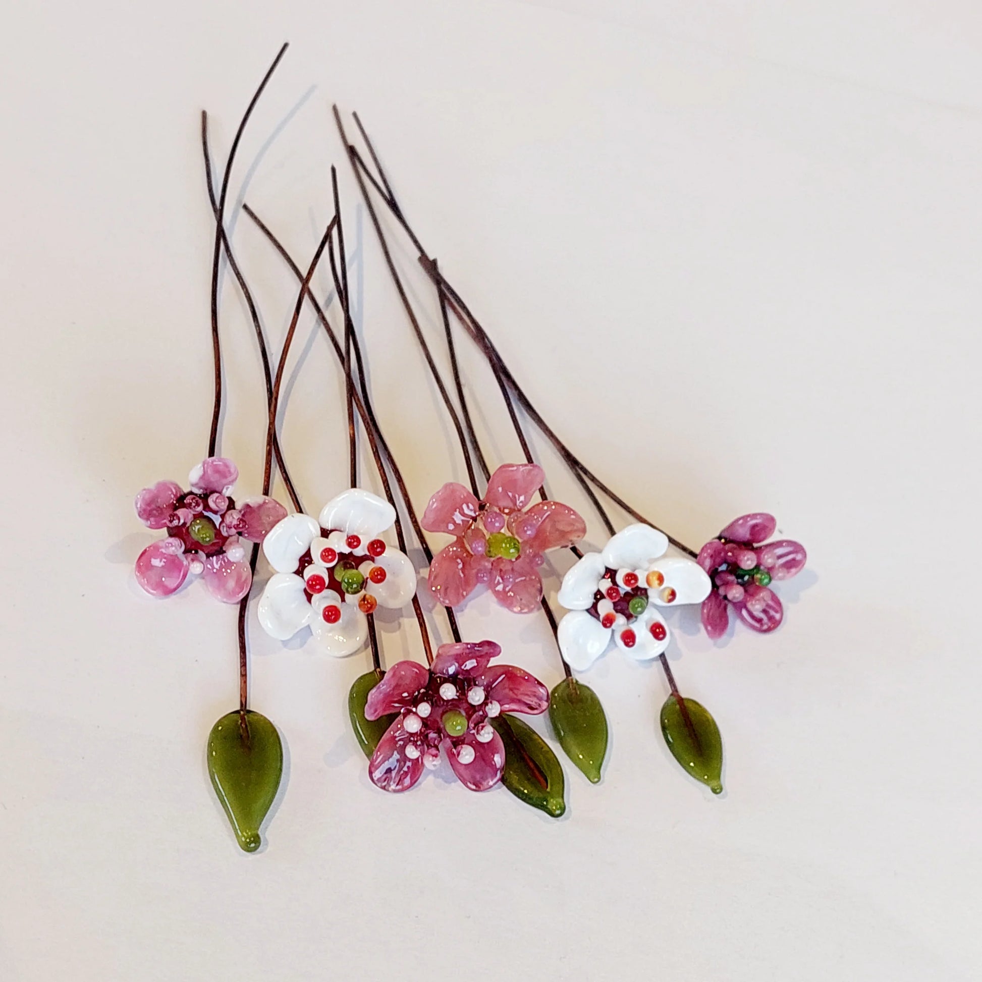 About the Artist: Glass Artist, Selma Rainey of Rainey Designs, has created these miniature flowers by crafting each stem by hand, via the process of lampwork (method described below).
